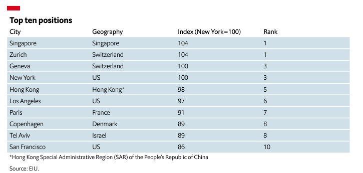En el reciente ranking de ciudades más caras para vivir, elaborado por el Economist Intelligence Unit de The Economist, Singapur y Zúrich ocuparon el primer lugar como las ciudades más caras del mundo en 2023. Singapur destaca por tener los precios más altos en transporte, ropa, comestibles y alcohol debido a estrictos controles gubernamentales, mientras que el aumento en Zúrich se atribuye a la fortaleza del franco suizo y a los altos precios de los alimentos, bienes domésticos y recreación.