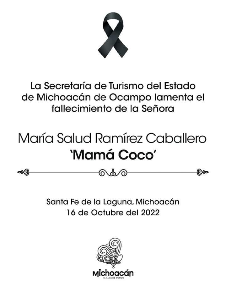 Roberto Monroy, secretario de Turismo de Michoacán, comentó en sus redes sociales: “Lamento profundamente el fallecimiento de doña María Salud Ramírez Caballero ‘Mamá Coco’, mujer incansable y gran ejemplo de vida y quien fuera inspiración para este amado personaje que dio la vuelta al mundo. Mis oraciones para su descanso eterno y para que su familia encuentre pronta resignación”.